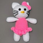 Pembe ve beyaz tonlarda tasarlanmış, sevimli amigurumi kedi oyuncak.